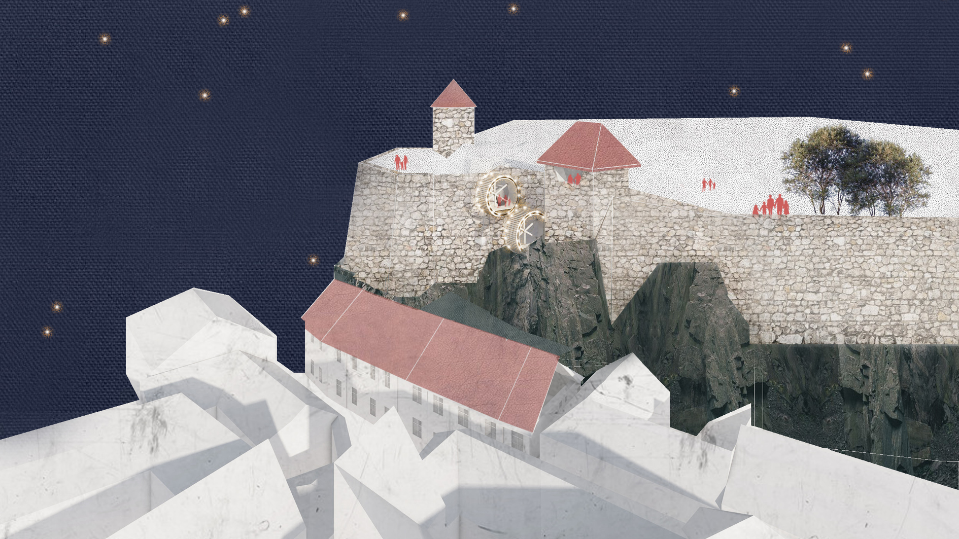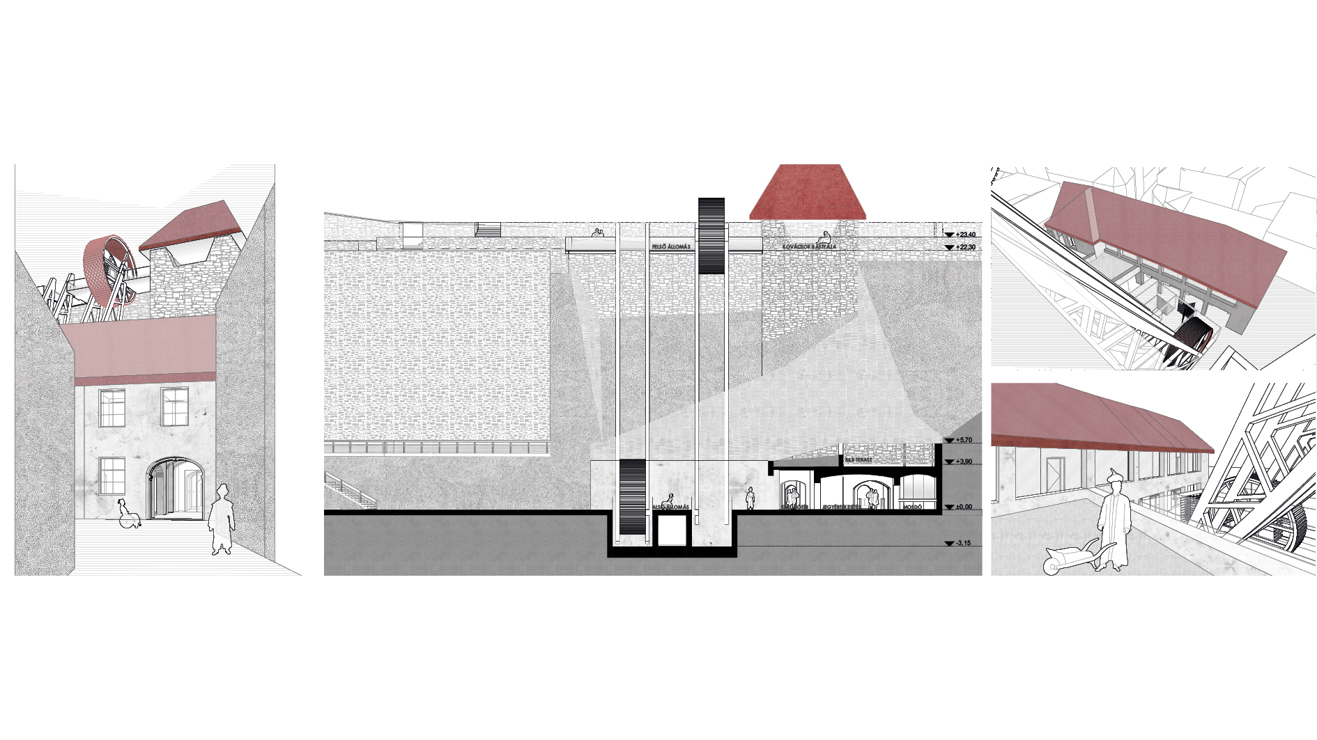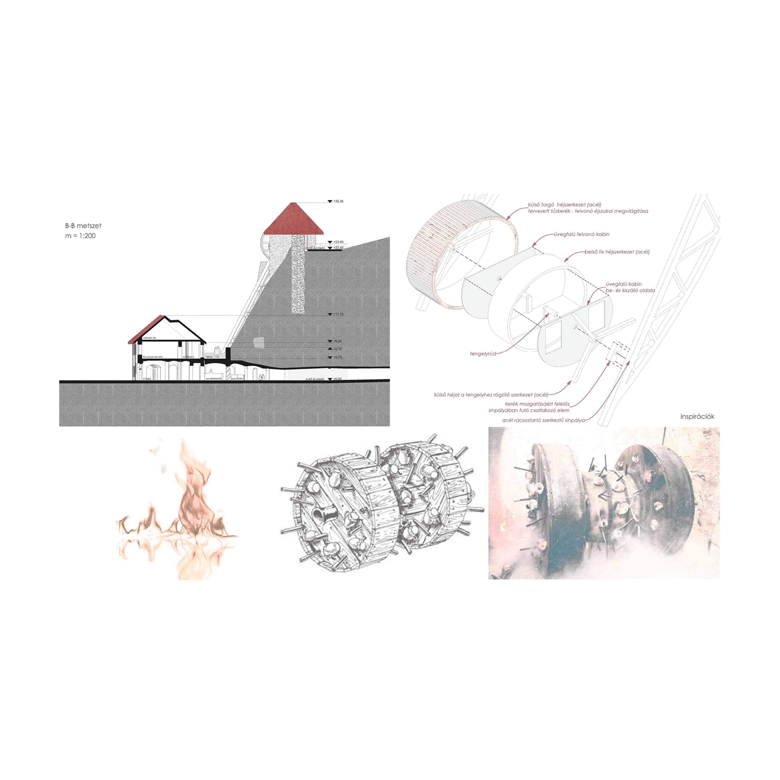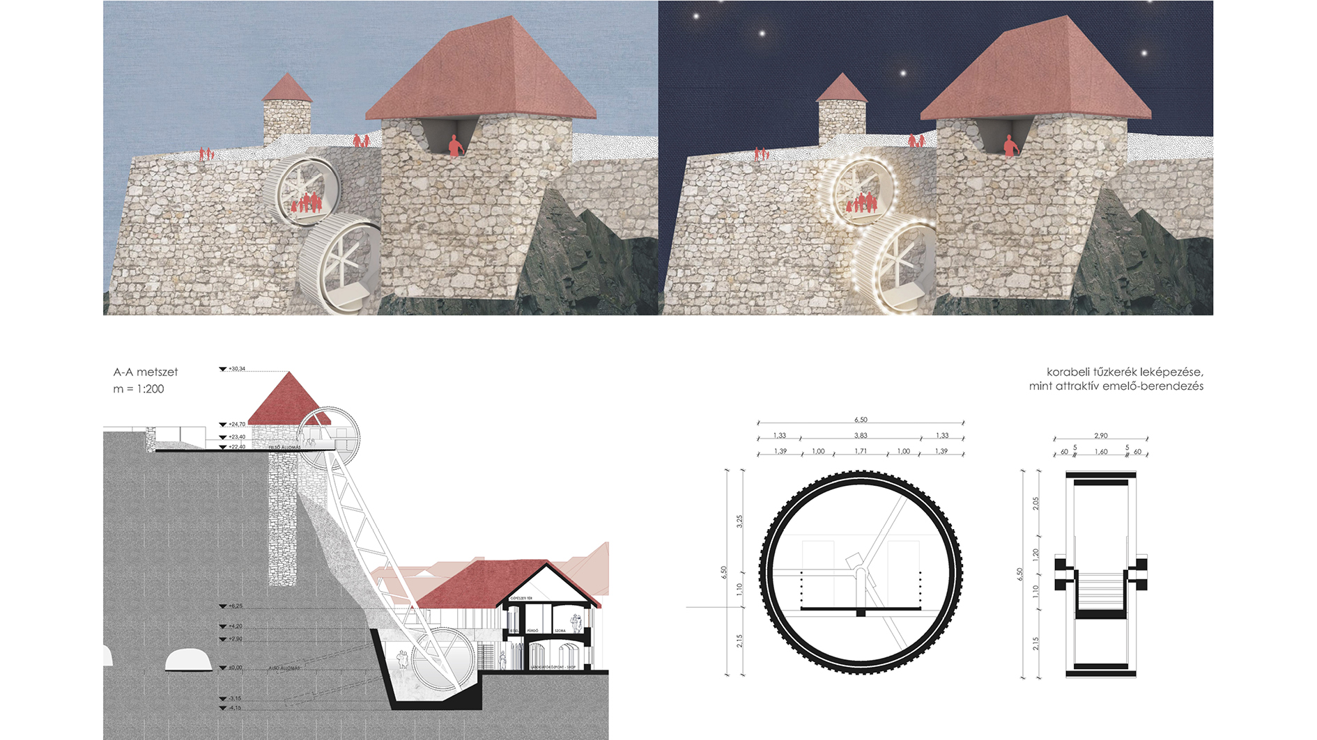 A beavatkozás akcióterületének megválasztásakor a nem hétköznapi környezeti adottságokkal rendelkező helyszínen, a jelenlegi beépítési struktúra mellett, a funkció telepítésénél a történelmi hátterét vettük kiindulásnak. A célunk az volt, hogy a várfal menti korábbi fejlesztési területhez kapcsolódva, azt kiegészítve amolyan lánc-szerűen fejlődő struktúra jöjjön létre, és a teljes várfal szakasz közlekedőrendszerét szintenként állandó látványelemként kiegészítse a beépítésre kerülő elem. A regény-beli tűzkerék leképezéseként létrejött kettős tűzkerék-felvonóból ugyanis az egyik mindig látható a várfal Dobó Bástya – Kovácsok Bástyája közötti szakaszán.