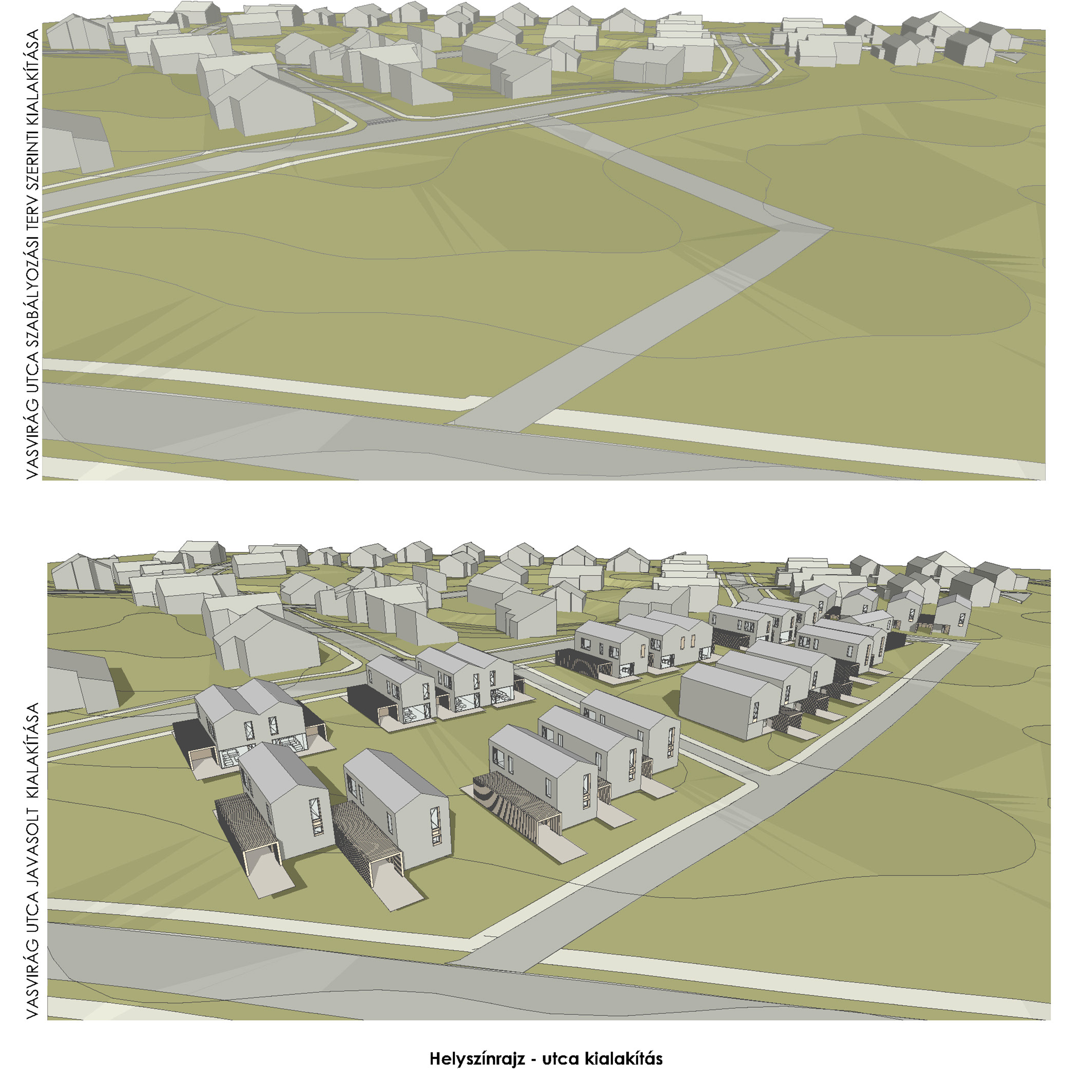 Az így kialakult végső változatban optimalizálni tudtuk a telekosztást. Összesen kilenc darab telek kialakítását javasoltuk. A telkeken sorház-szerű beépítéssel állnának az épületek, jogilag társasházként. Kétféle háztípust dolgoztunk ki - egy szélesebbet (nappali + négy szoba), és egy keskenyebbet (nappali + két szoba).